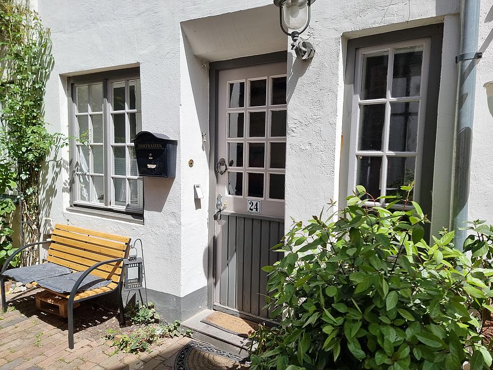 Von außen reiht sich das Haus mit seiner historischen Fassade harmonisch in die Gangbebauung ein. Die Bank lädt zum Verweilen und Eintauchen in das "Gangleben" ein.