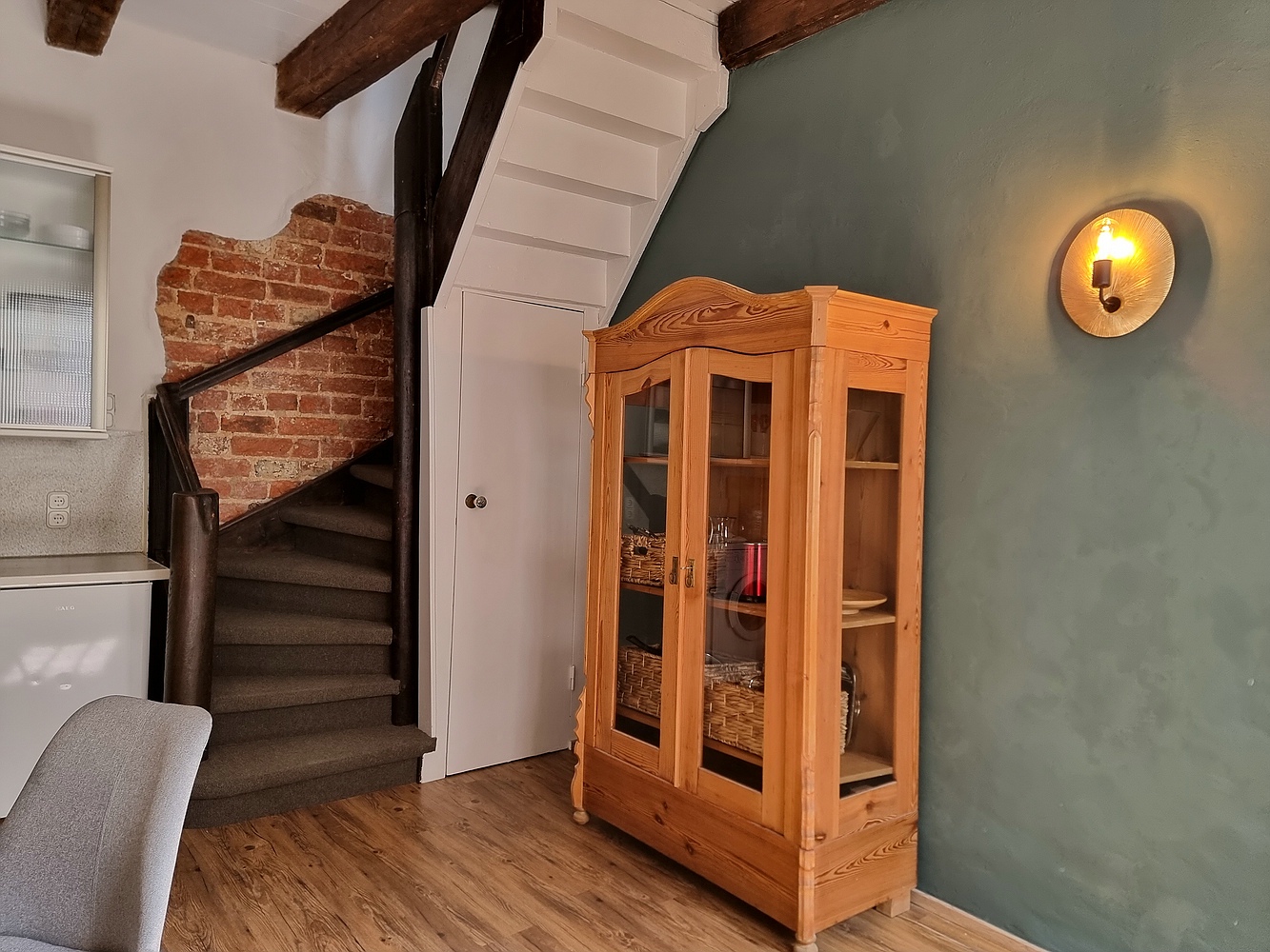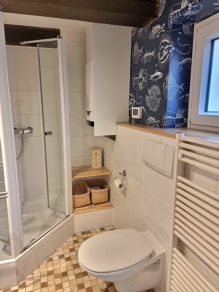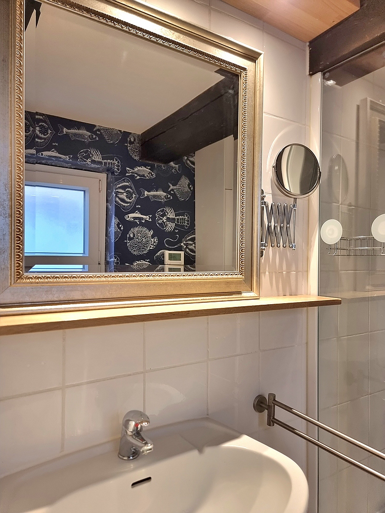 Im 1. OG findet sich das kleine Duschbad. Durch die zahlreichen Ablageflächen könnt ihr euch gemütlich einrichten, ohne dass ein Gefühl der Enge aufkommt.