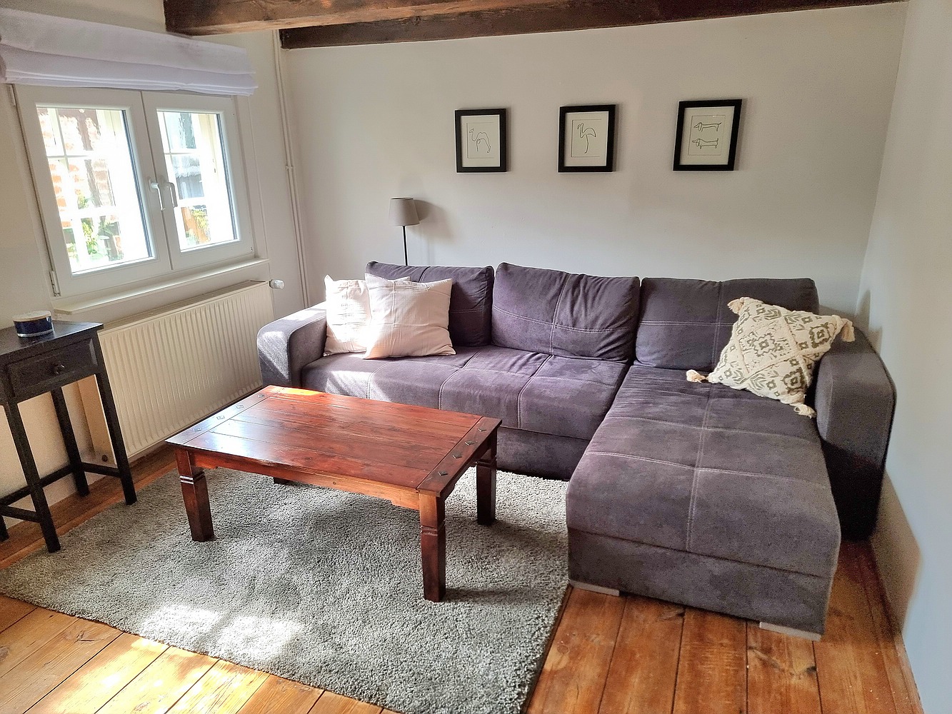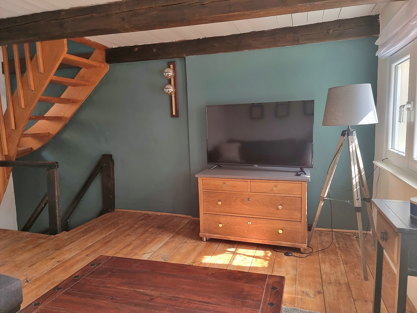 Ob chilliges Zusammensein oder gemütlicher Fernsehabend, hierfür ist das Wohnzimmer im 1. OG die beste Wahl. Die Holzbalkendecke ist niedriger als in der Wohnküche und die große Couch lädt zum Entspannen ein.