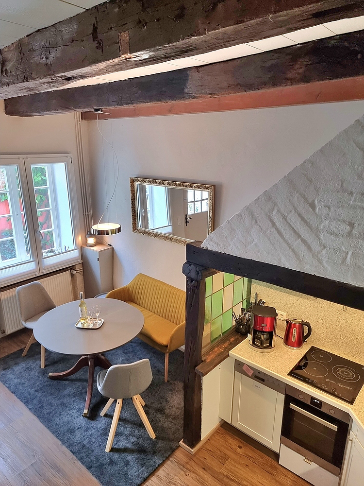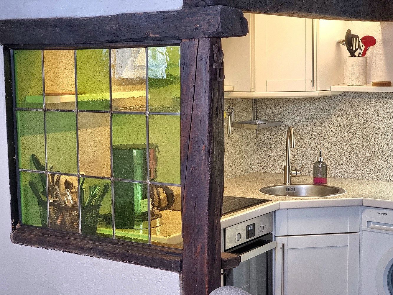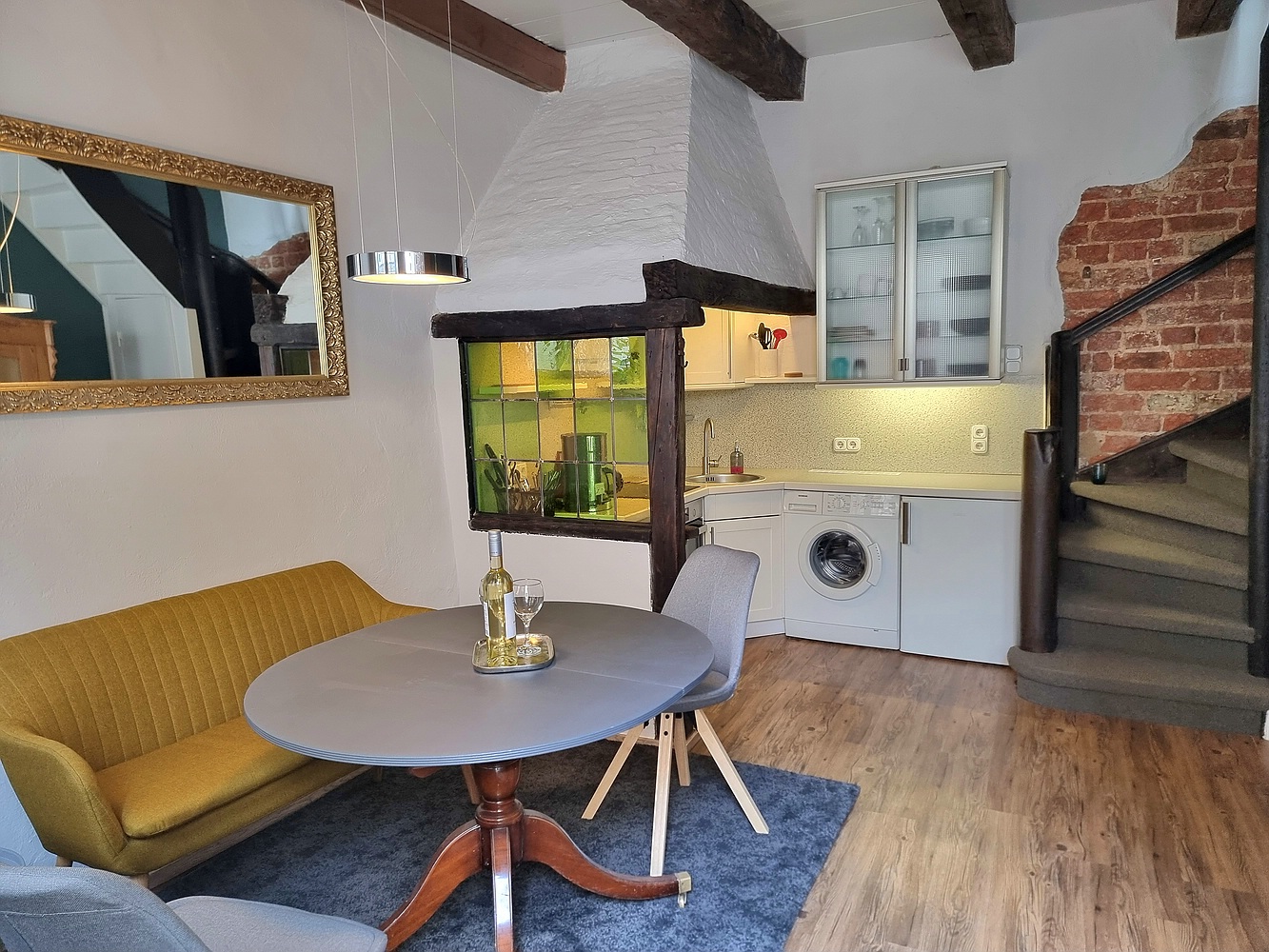 Das Herz des Hauses ist die gemütliche Wohnküche im Erdgeschoss. Unter der 3m hohen Holzbalkendecke lässt es sich wunderbar kochen und zusammen sitzen.