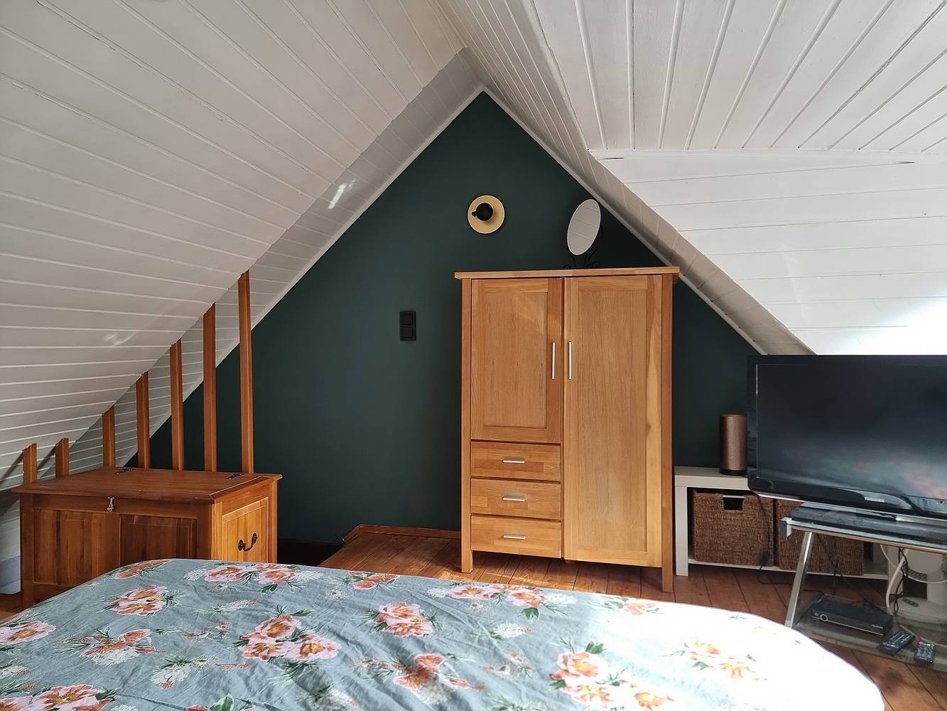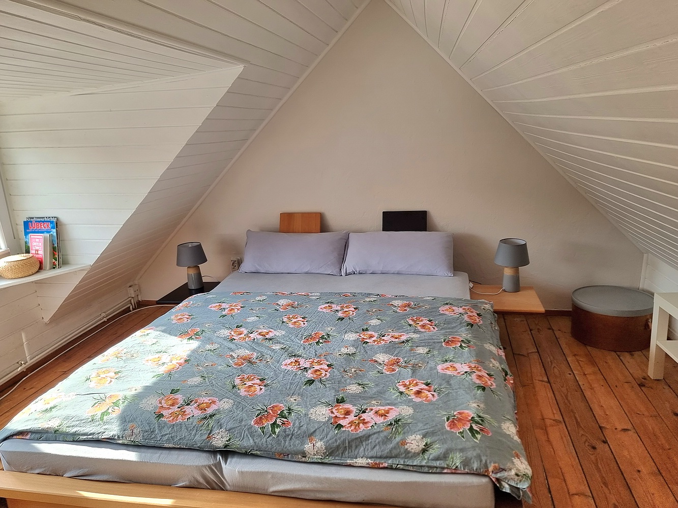Zum Schlafen geht es ganz nach oben unter den Giebel des Hauses. Große Leute sollten besser auf den Kopf achten, werden sich aber wie alle anderen auch im gemütlichen Schlafbereich wohl fühlen. Die großen Fenster mit Blick über die Ganghäuser lassen sich mit den Jalousien verdunkeln.